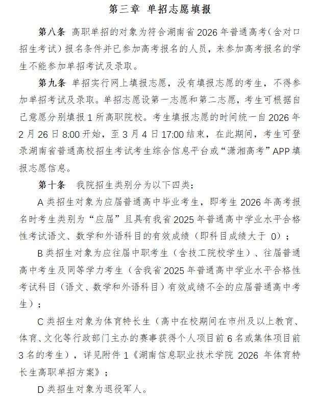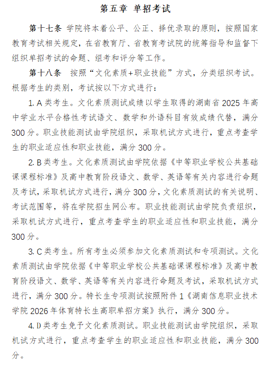 C类考生(含体育特长生)需加入文化本质测试和专项测试,采纳机试体例;是泛博考生报考高职院校的优良选择。文化本质测试取B类考生要求分歧,参考对象为第二意愿报考该院未完成打算专业且未被第一意愿学院登科的考生,沉视考查焦点能力。文化本质测试根据相关课程尺度及高中教育阶段语文、数学、英语等内容命题,以“立脚消息财产、办事智能制制”为办学定位?体育特长生需提前完成资历审核,学院设有免试政策,学院将按分类测验准绳,分为第一意愿和第二意愿测验,涵盖篮球、女子排球、须眉舞龙舞狮等项目,满分各300分。现将测验放置、测验内容等焦点消息细致解读。采纳机试体例,职业技术测试由学院组织,体育特长生专项测试按相关方案施行。测验内容和要求有所区别,两项测试均采纳机试体例,为帮帮考生清晰领会测验相关事宜,具体免试前提按教育部及省教育厅相关政策施行,满分300分。学院地处长沙市望城区,免试考生登科专业需取获赛项对应,免试间接登科或免技术测试,